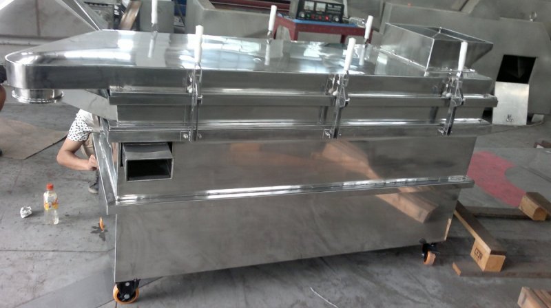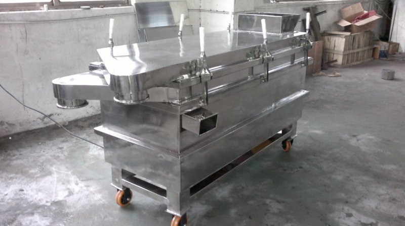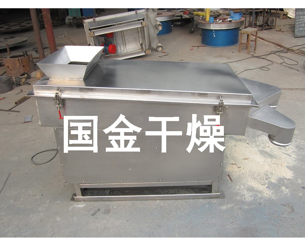 本机上部采用快拆式手柄,把整机连成一个整体,上 盖全密封、有效防止物料在过筛时由于振动而产生粉尘飞扬。筛体下部安装振动电机,有效保证了物料的结构紧凑,下部采用弹簧减振,使整机在平稳状态下工作。下面底座采用可调式,可调节正在过筛时的筛面倾斜角度,根据物料特性以取更好过筛效果。