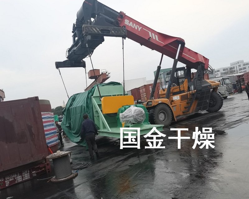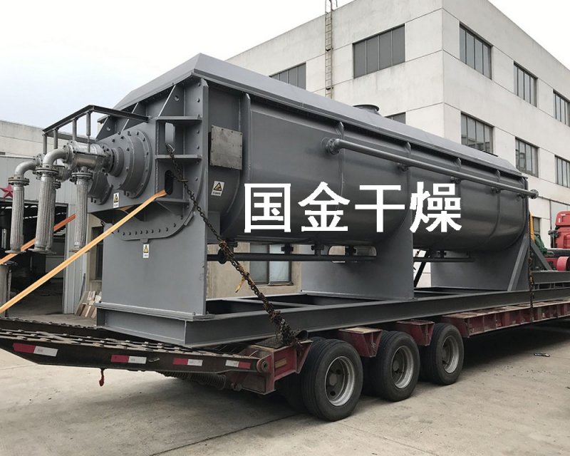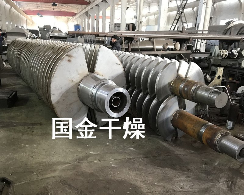 热风通常由干燥机中部送入,通过呈搅拌状态的物料层表面,从另一侧排出。双轴桨叶干燥机内部。加热介质可以用蒸汽、热水,或高温导热油。
