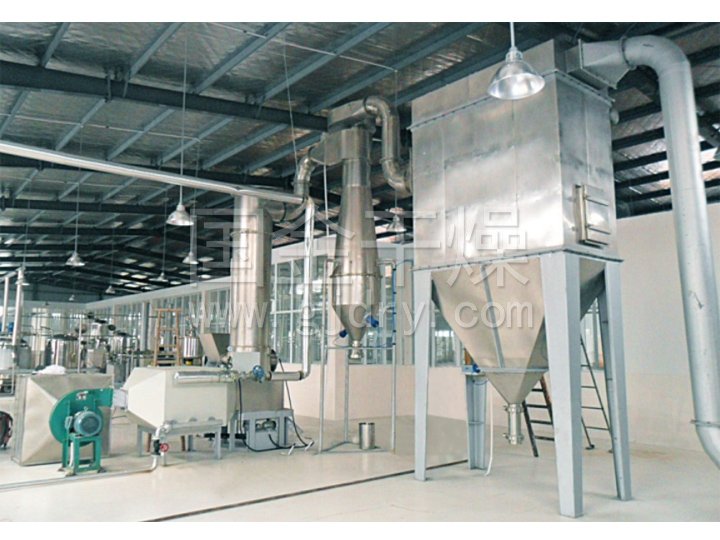 热空气切线进入干燥器底部,在搅拌器带动下形成强有力的旋转风场。膏状物料由螺旋加料器进入干燥器内,在高速旋转搅拌桨的强烈作用下,物料受撞击、摩擦及剪切力的作用下得到分散,块状物料迅速粉碎,与热空气充分接触、受热、干燥。脱水后的干物料随热气流上升,分级环将大颗粒截留,小颗粒从环中心排出干燥器外,由旋风分离器和除尘器回收,未干透或大块物料受离心力作用甩向器壁,重新落到底部被粉碎干燥。